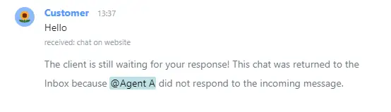 If an agent accepted the chat but did not answer it within the set time, the chat will return to the Inbox tab and will be offered to all operators assigned to the channel.