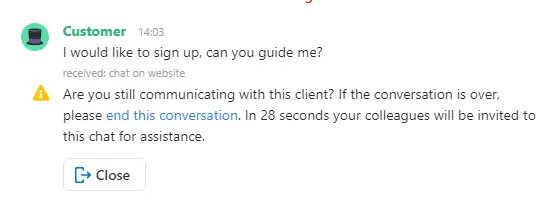 If the agent ignores the notification, the chat will be displayed to the other operators assigned to the channel. After receiving the notification, the new agent can join the chat to help the client or end the conversation by clicking the appropriate button on the chat screen.