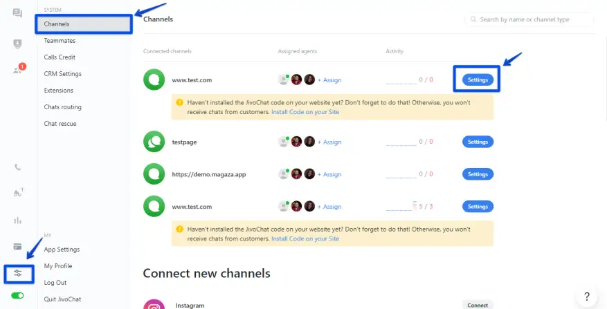 1. In the JivoChat app or Web app, click go to Manage -> Channels -> Settings (next to the website name).