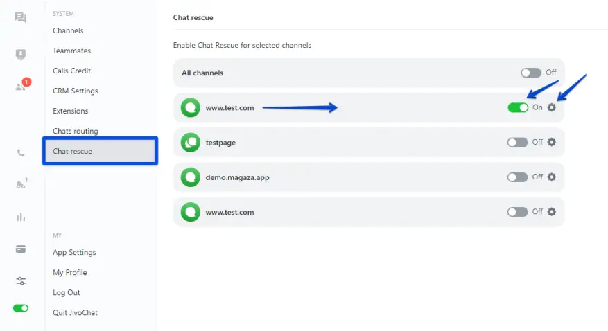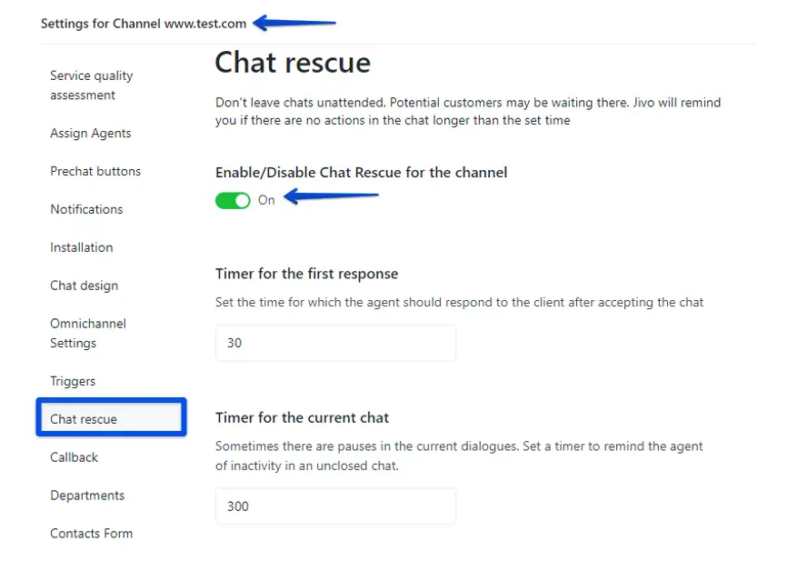 2. Select Chat Rescue in the channel settings and activate the Enable/Disable Chat Rescue for the channel slider.