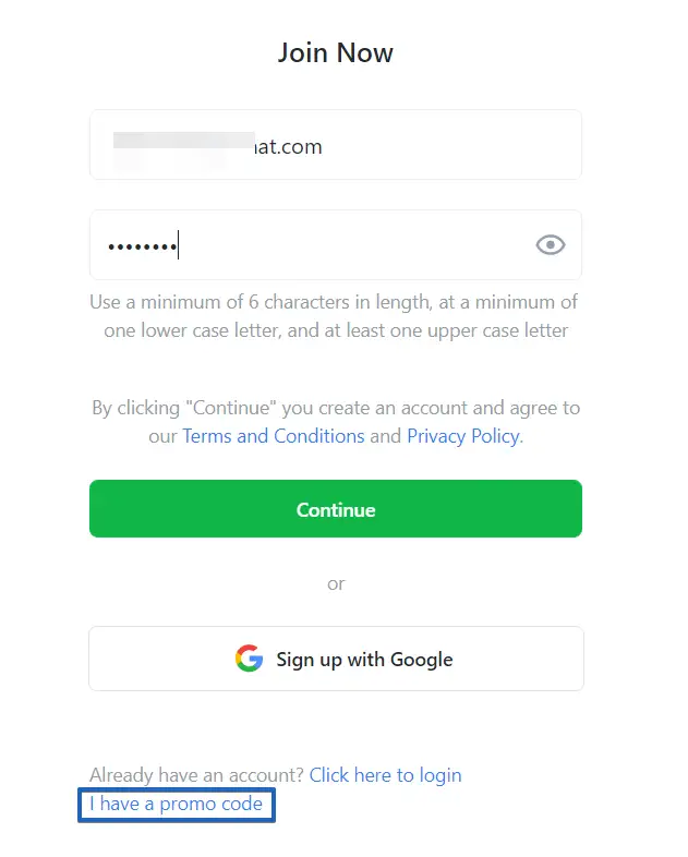 2. Now simply typy your promo code in the indicated field and press "Continue".