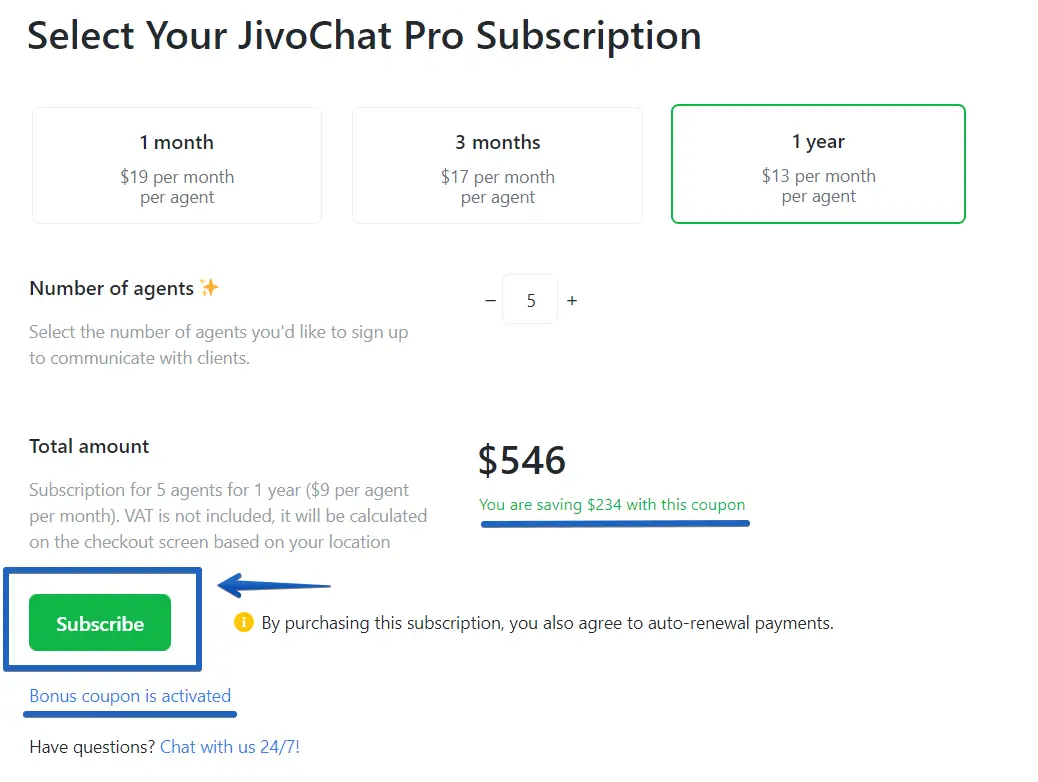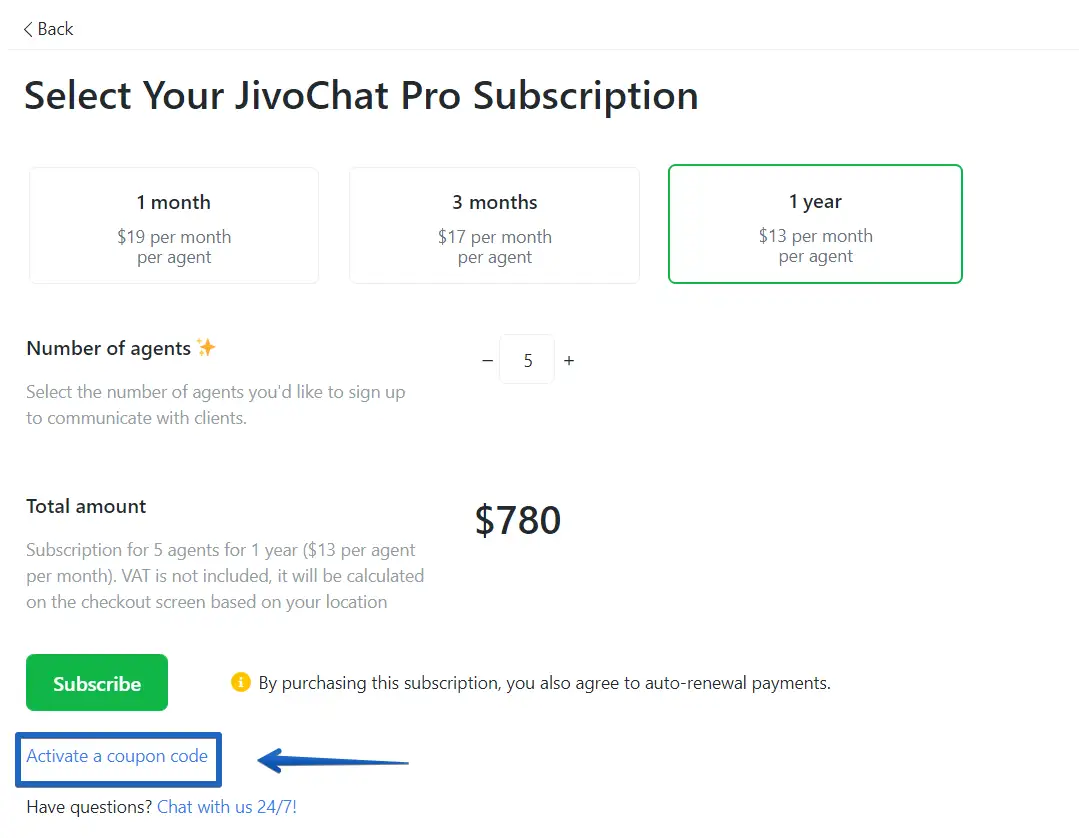 Discount codes are used to apply discounts on the value of JivoChat Pro licenses during the purchase. If you have a discount code in hands and wants to use it during the checkout of JivoChat Pro licenses, please follow the steps below.