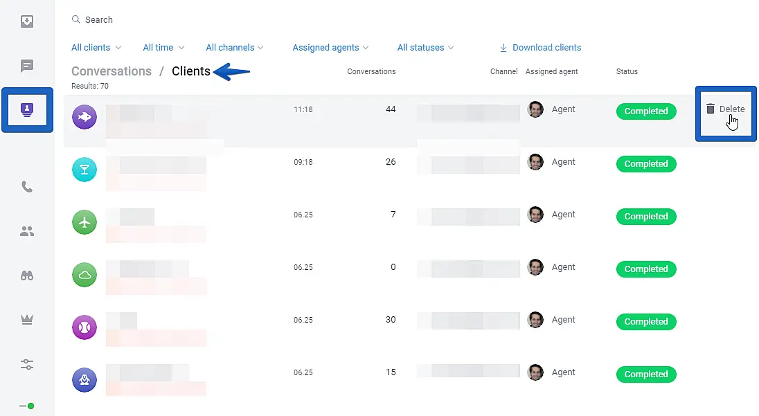 To delete the data of a visitor or client along with all communication archives with that person, access your JivoChat web app or any of our Desktop apps and go to Archives -> Clients.