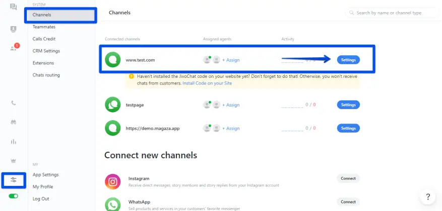 To change the design settings of your JivoChat widget, please log in to our Desktop or Web app and go to Manage -> Channels -> Settings (next to the website name).