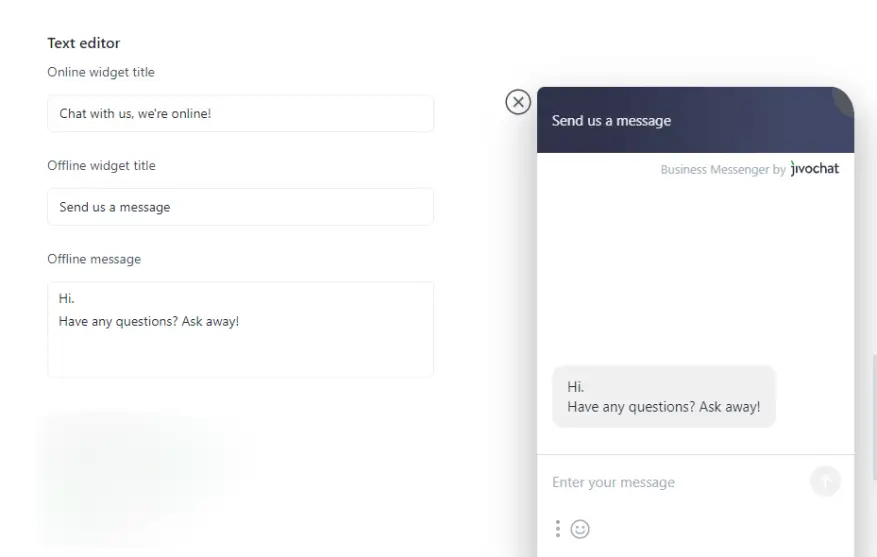 In this section, you can change the texts that are used on the chat button and in offline mode. Also in this tab, you can change the text of the offline message form (which is shown when clients click to open the chat widget manually).