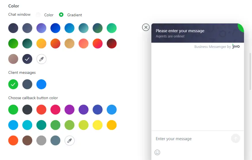 In the Color subsection you can set colors for the chat button: choose a color scheme from the available options or even customize your own color by clicking on the dropper icon. Both monochrome and gradient design of the chat button is possible.