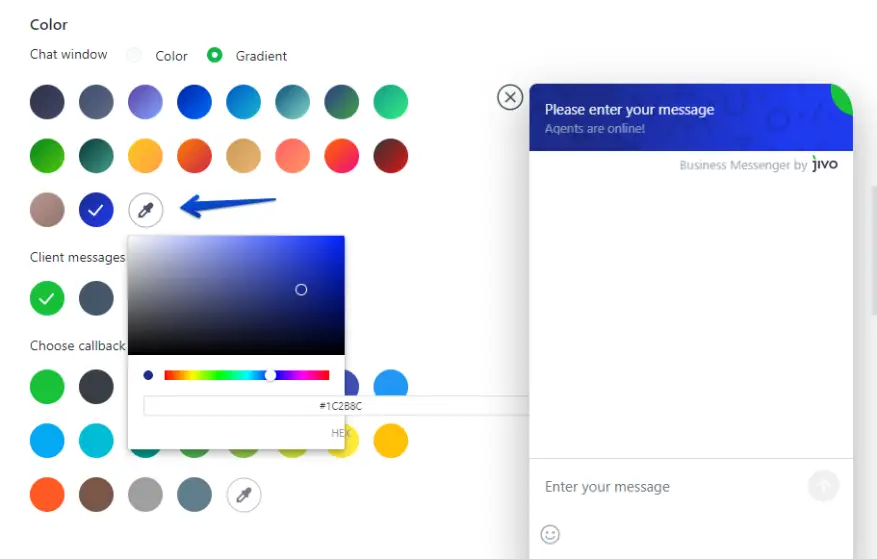 The settings also allow you to adjust the background of the client's messages and the color of the callback button. These colors can be selected from a list of suggested colors.