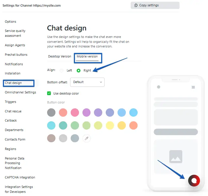 It is also possible to customize the look of the chat on the mobile version of your site. You can choose the color of the chat button from the suggested colors, or even customize your own color. You can checkmark the option "Use desktop color" to use the same colors as your desktop widget. In addition, you can choose which side the chat button will be located on: on the right or on the left.
