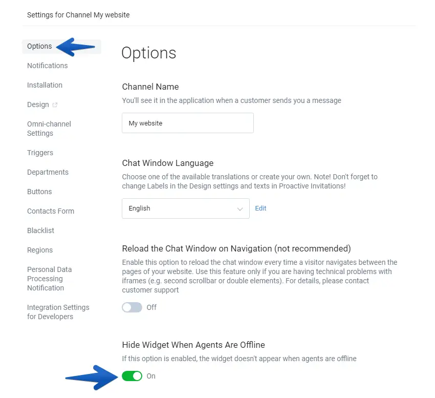 The feature "Hide the JivoChat widget when all agents are offline" automatically hides the widget on a website if all agents are offline or in away mode. If you disable this feature, then an offline form for sending a message to an email will be displayed to your visitors. The default setting is "off".