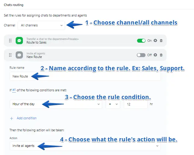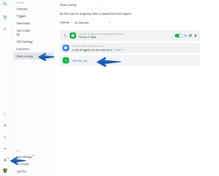 Log into your JivoChat account -> click "Manage" -> Chat routing -> "Add the rule"