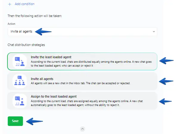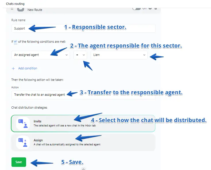 - Select a distribution strategy from the available options: INVITE OPERATOR TO CHAT or ASSIGN CHAT TO OPERATOR;