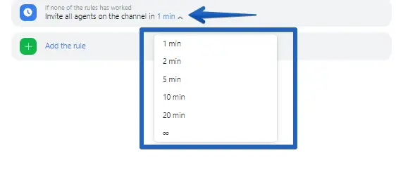 Now the fallback rule trigger time can be changed. Instead of the default 60 seconds, you can increase the timeout for the priority rule to run. This will reduce the probability that the client message will be distributed according to the fallback rule - that is, that it will reach all operators in the channel.