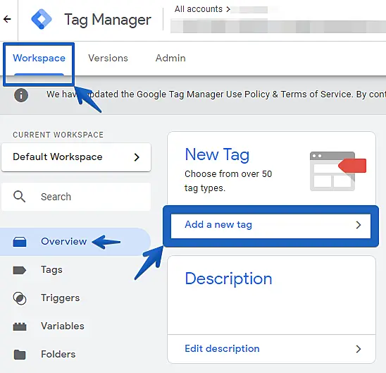 Access the Google Tag Manager panel and go to Workspace -> Overview -> Add a new tag.