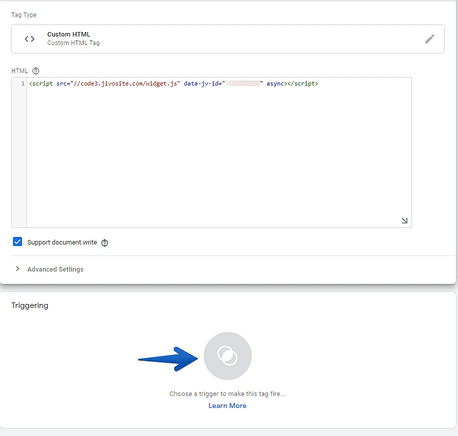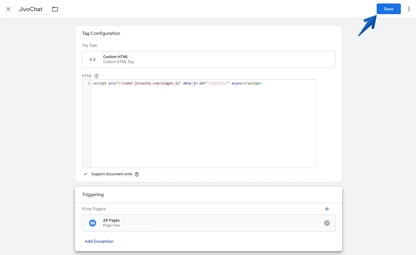 Insert a name for the tag you're creating, paste the JivoChat installation code in the "HTML" field and checkmark the option "Support document.write".