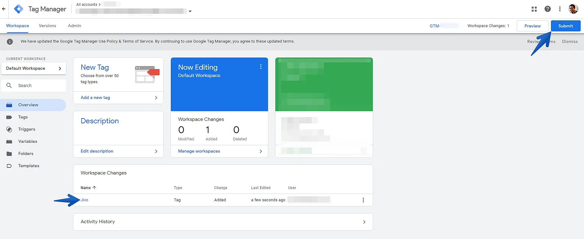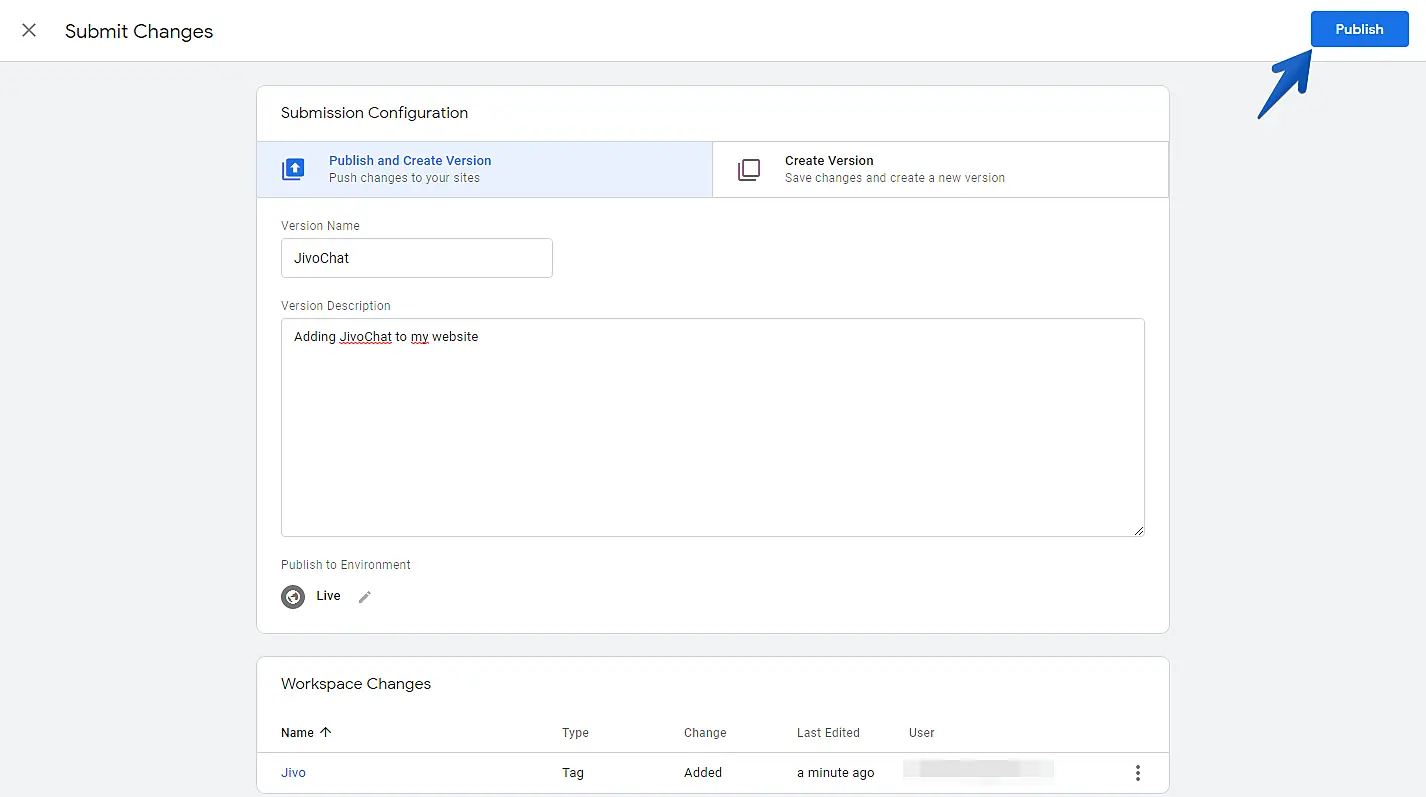 Check if your new tag has been saved in the workspace. Now all you need to do is publish all changes so that the new tag is sent to your website. Click the "Submit" button.