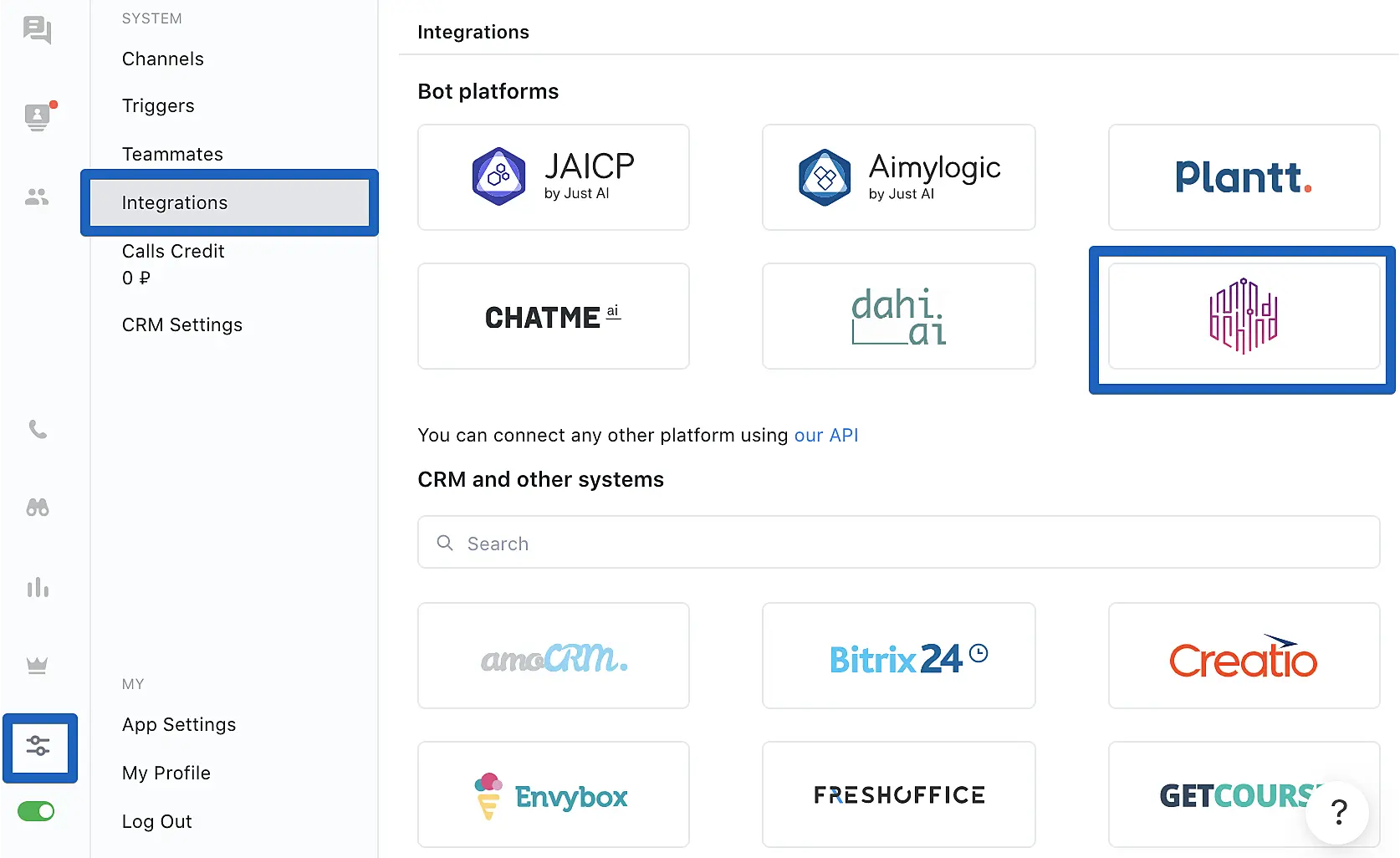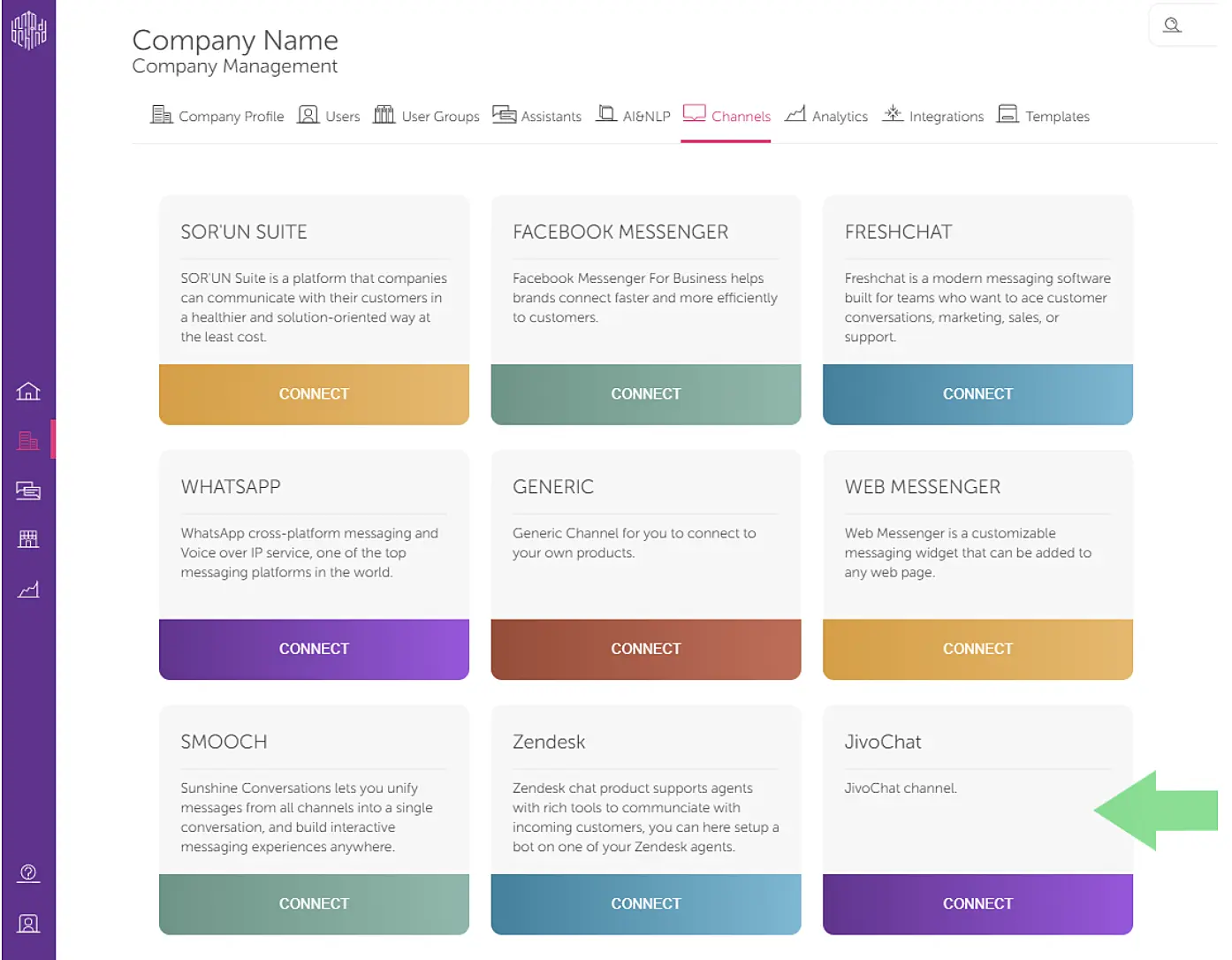 When you're done with registration, in the MindBehind interface open company management page, select "Channels", locate the "JivoChat" channel and click "Connect".