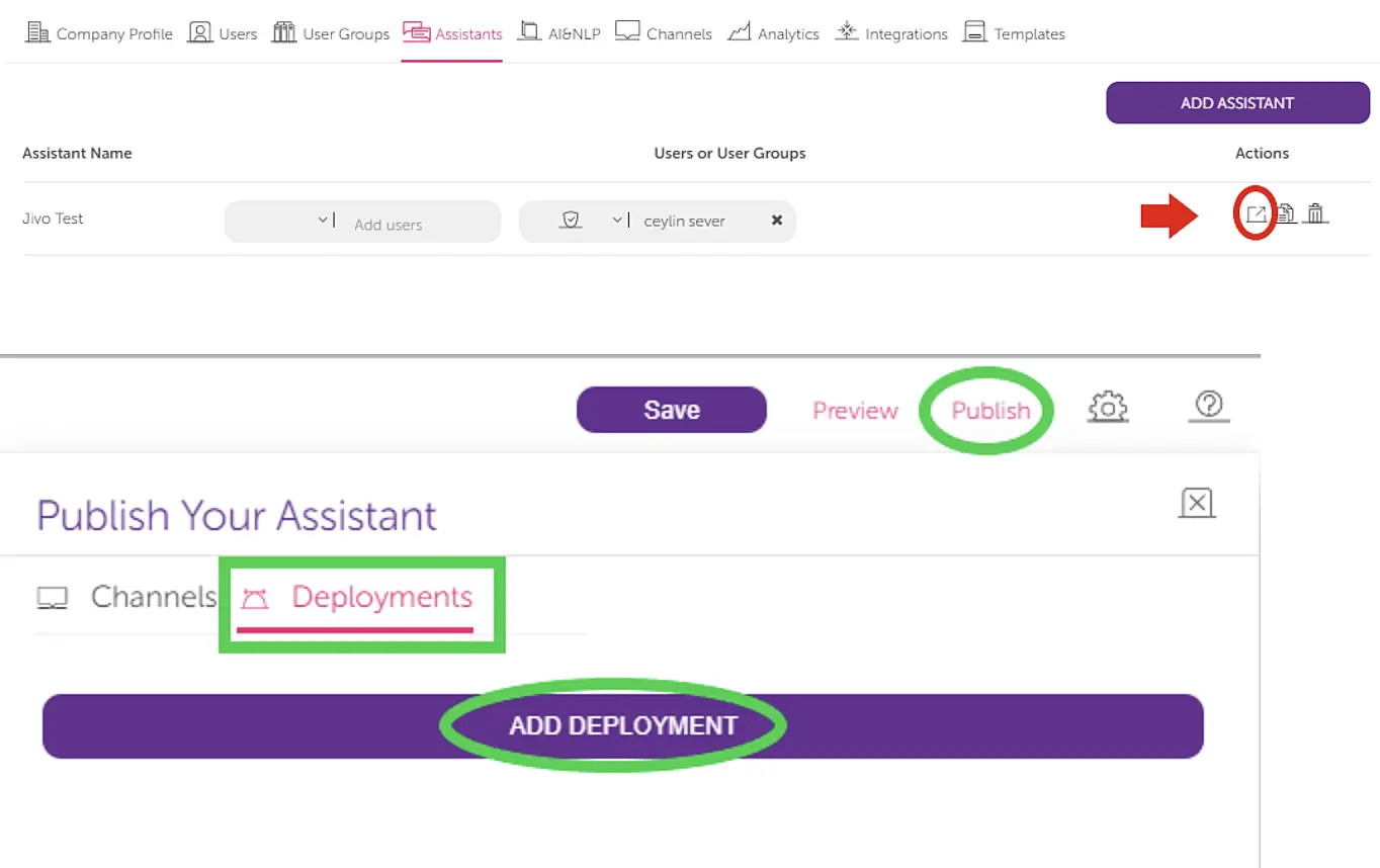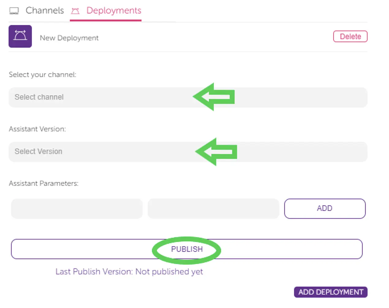 Now you need to add your new channel as a new deployment. Go to your "Assistant Map" by following these steps: "Publish" > "Deployments" > "Add Deployment".