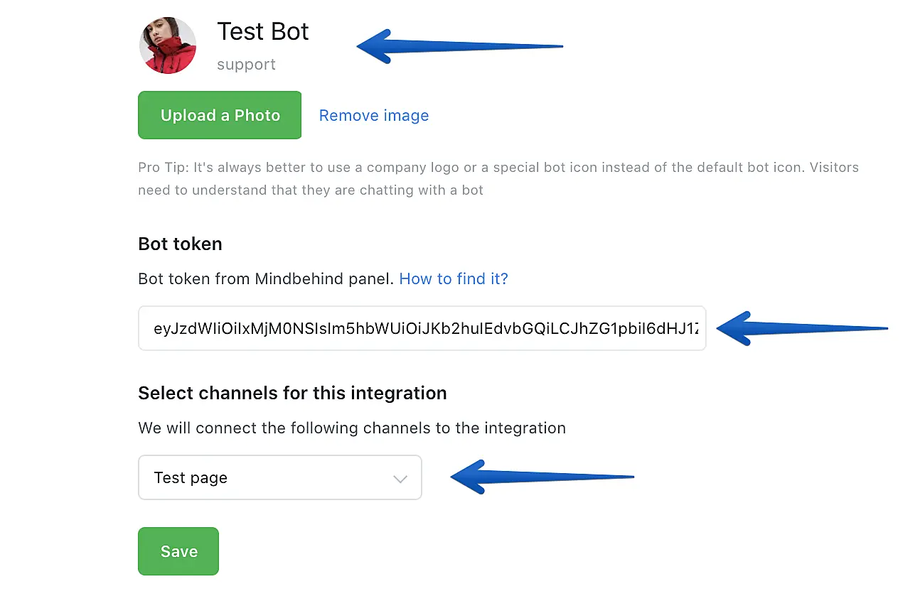 Enter the bot’s name, upload a picture, and select what channels you want to connect the bot to. When all is set, press "Save".