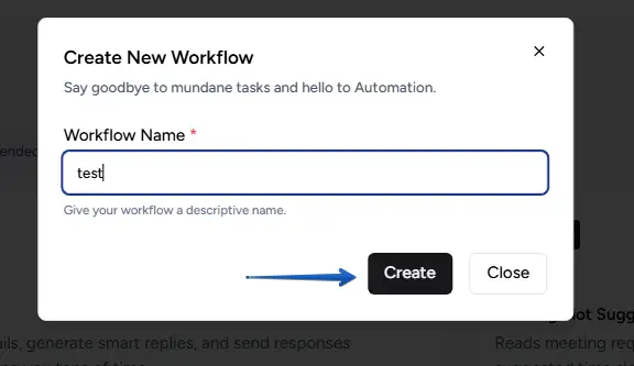 A dialog box will appear. Enter a name for your workflow (e.g., "test") and click Create.