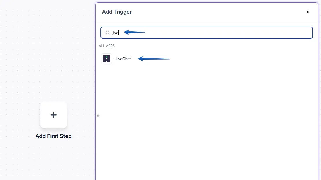 This will open the "Add Trigger" menu. In the search bar, type "JivoChat" and select it from the list of applications.