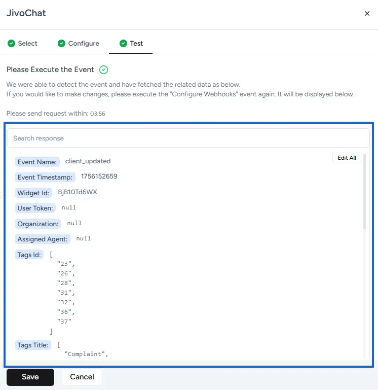 Ottokit will listen for this event. Once received, it will display the data it fetched from JivoChat, confirming a successful connection. Click Save.