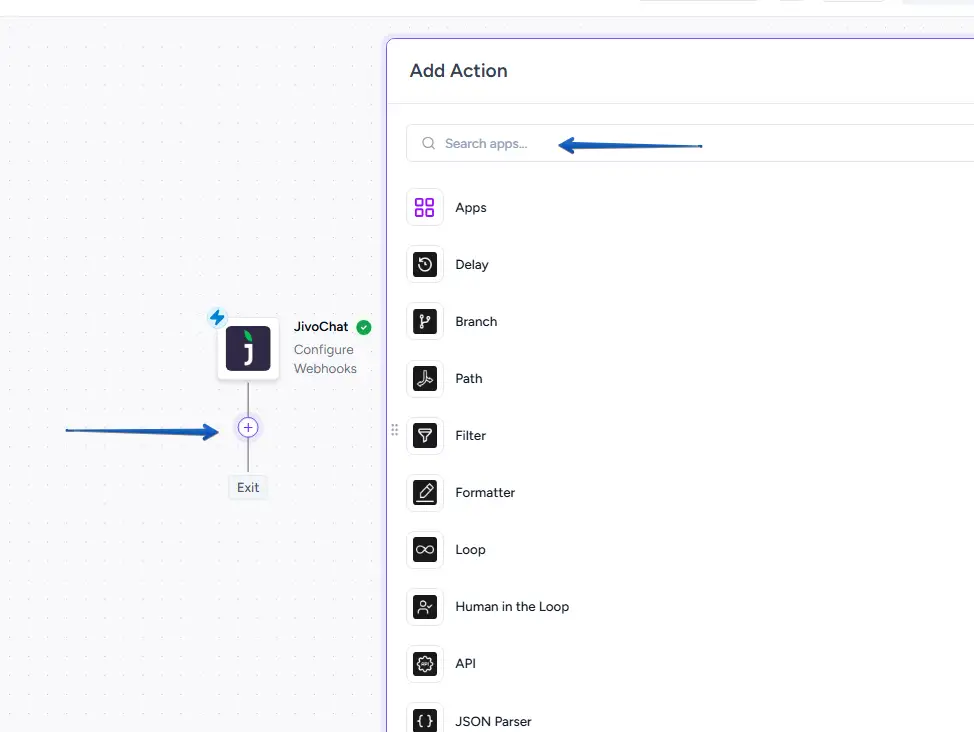 This will open the "Add Action" menu, where you can search for another app to send your JivoChat data to or use one of Ottokit's built-in tools like Filter, Formatter, or Delay.