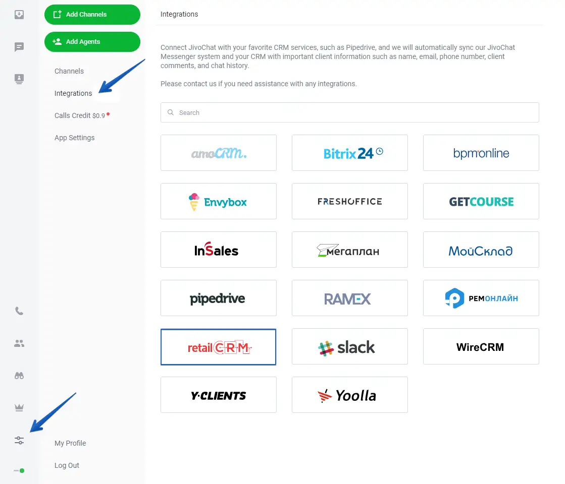 To integrate RetailCRM, open your JivoChat application and go to *Manage > Integrations and click on RetailCRM.