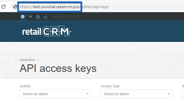 2.API token. On RetailCRM dashboard, click on the settings icon in the upper left corner, so you will switch to Administration mode. Then you need in the section Integration > API Access Keys. Copy the key from the opened page and use it when filling in this field.