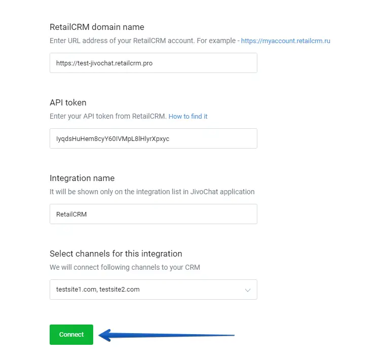 Done! After finishing chats in JivoChat app, you will receive data directly to your CRM. After connecting, the integration will appear in the "Connected integrations" list, where you can change its settings and view the event logs.