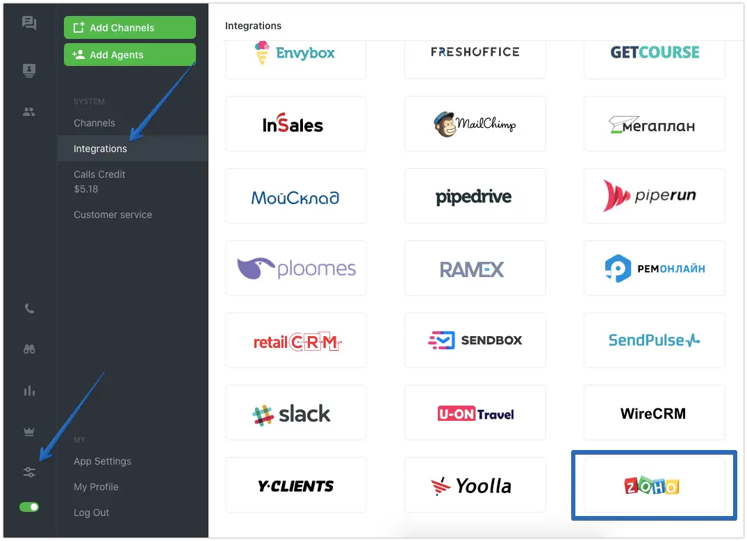 To integrate Zoho CRM, open your JivoChat application and go to Manage -> Integrations and click on Zoho CRM.