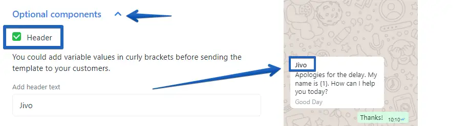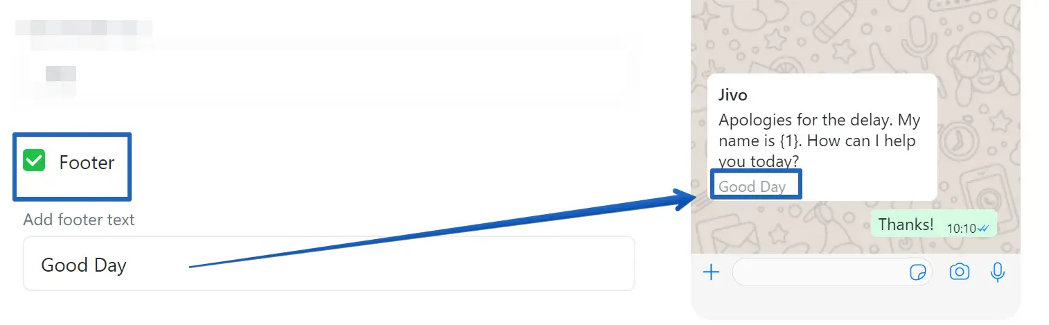The second is the footer, where you will insert a name that will appear at the end of the template message, as the image below demonstrates: