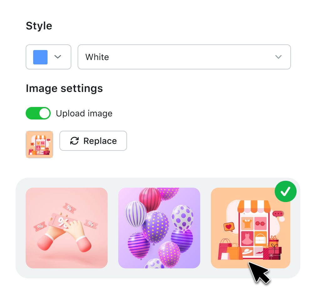 Configure popups that fit your style and design with colour themes and image options. Add images and emojis to chat chat campaigns to make your offers impossible to miss