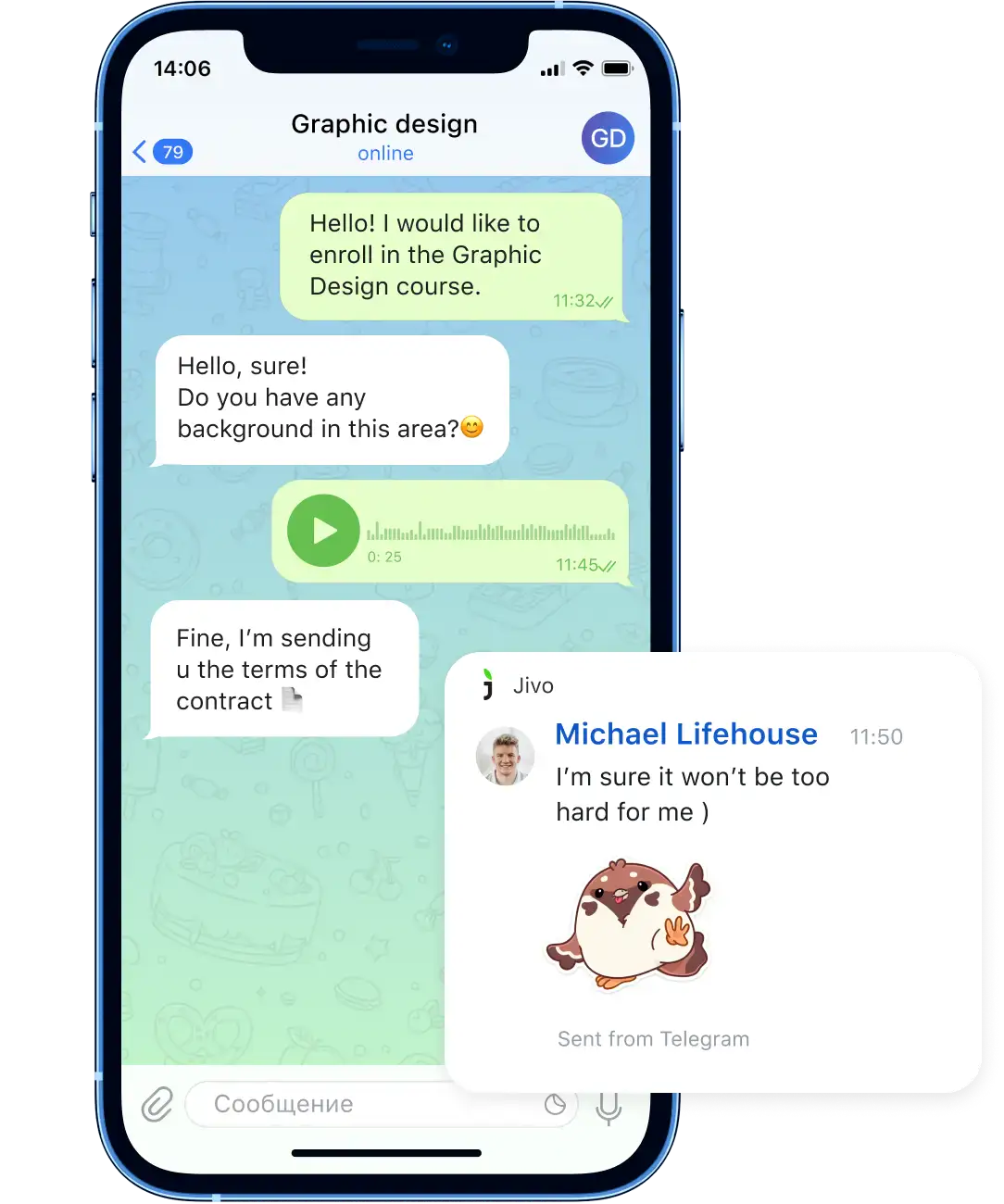 Messages from Telegram get into the JivoChat app and are distributed among the available agents. As a result, customers get answers and decide in your favor faster